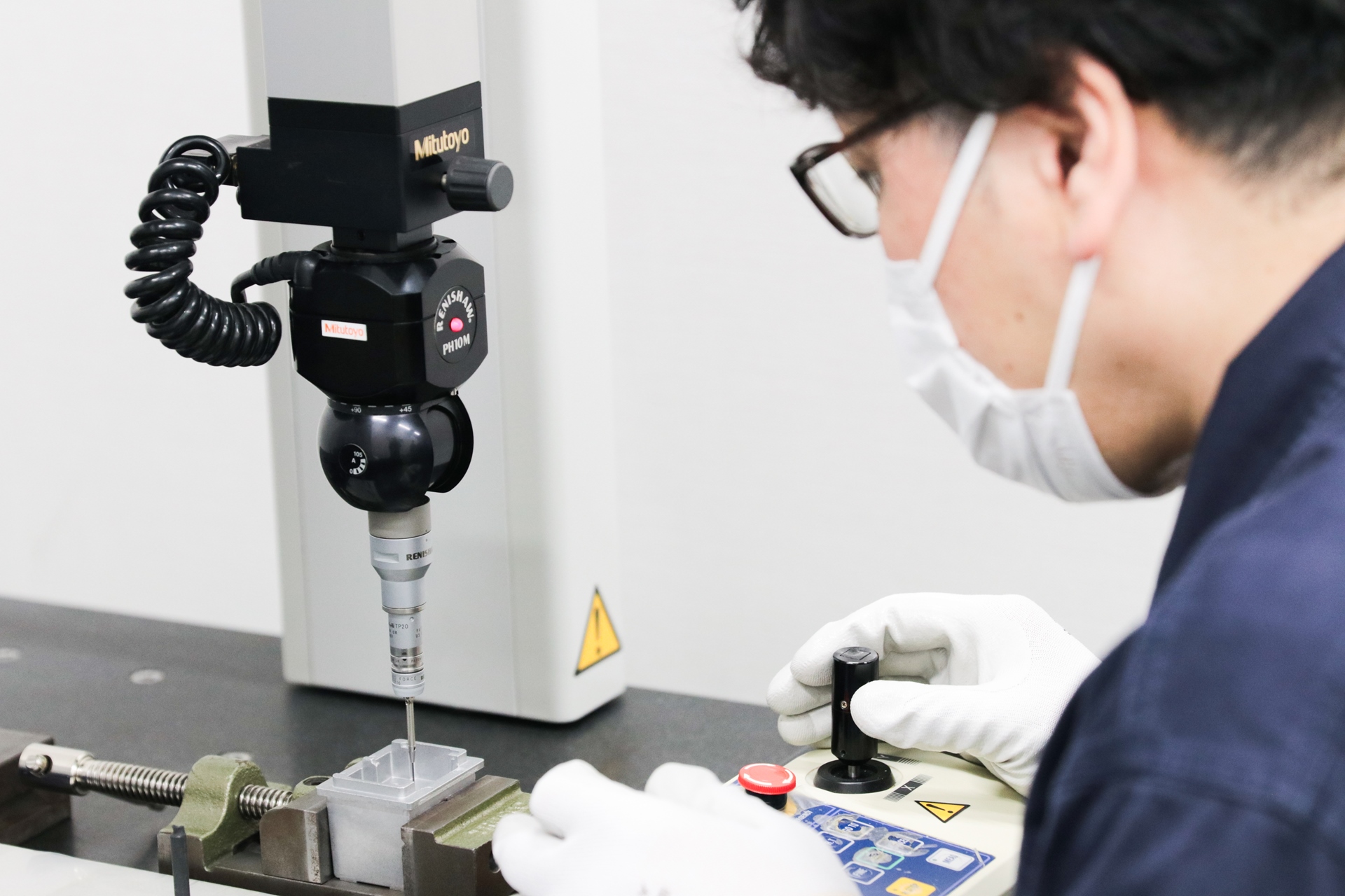 豊富な経験を積んだ社員の厳しいチェックの元、製品の外観、細かなバリなど一つ一つを丁寧にチェックしお客様の品質に対する要求にお応えしています。特に寸法測定を有する製品については保有する最新の測定器を駆使し、お客様の品質に対する満足感を高めています。